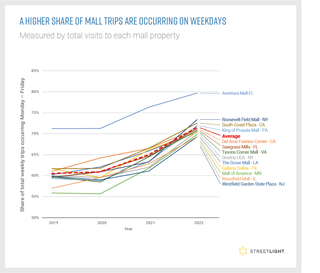 While the percentage of weekday trips dropped for some malls in 2020 — including Galleria Dallas in Texas, Tyson’s Corner in Virginia, and the King of Prussia Mall in Pennsylvania — by 2021, all 13 malls were seeing an upward trend in weekday trip share that would continue into 2022.